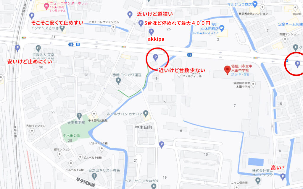 線路の高架下にもたくさん止めるところがあるんですが、車通りがあると止めにくいので注意です。