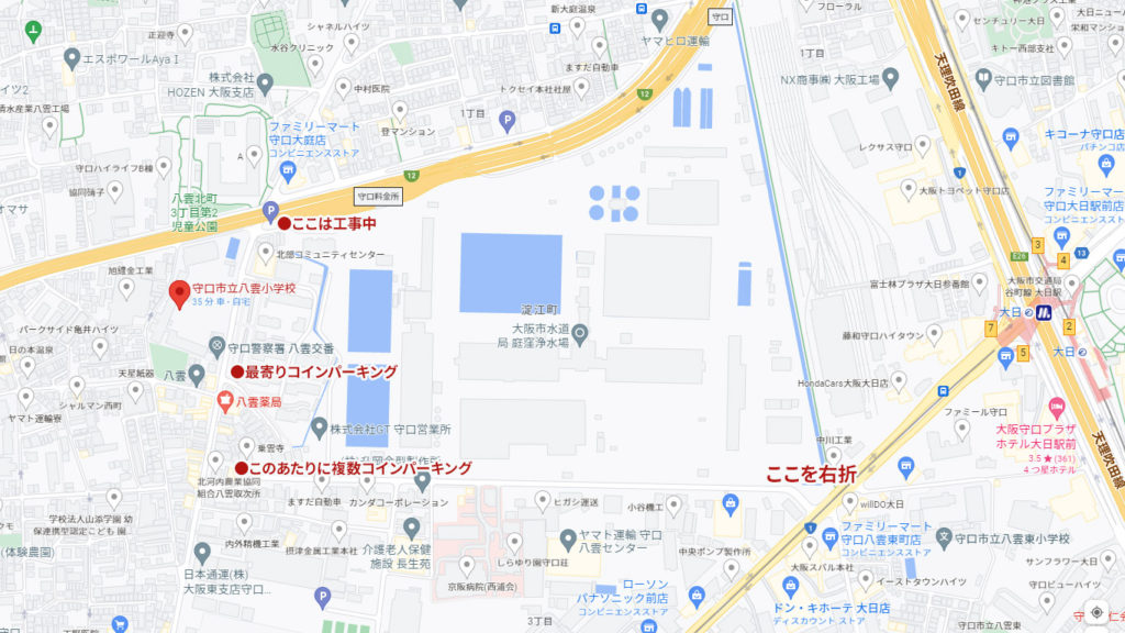最寄りにはいくつかコインパーキングがあったので、小学校の前にコインパーキングで子供たちを降ろし、車だけおきに行くなどする必要があるかもしれません。