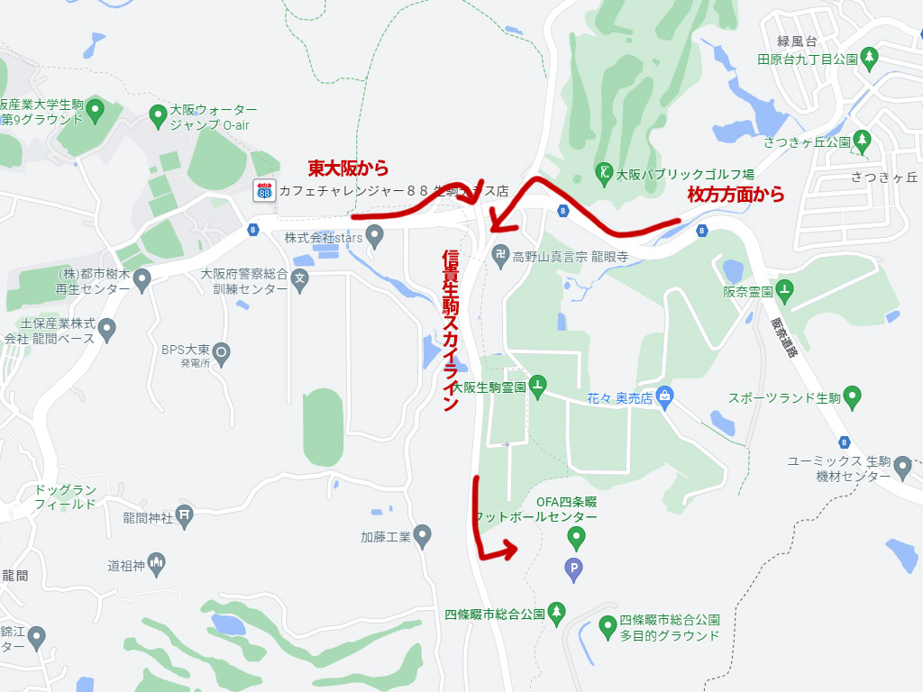 信貴生駒スカイラインは有料化されたという話を2025年春に聞きましたが、こちらを見る限りOFA四條畷フットボールセンターは無料区間なのではないかと思います。(近頃現地に行っていないのでまた確認してきます。)