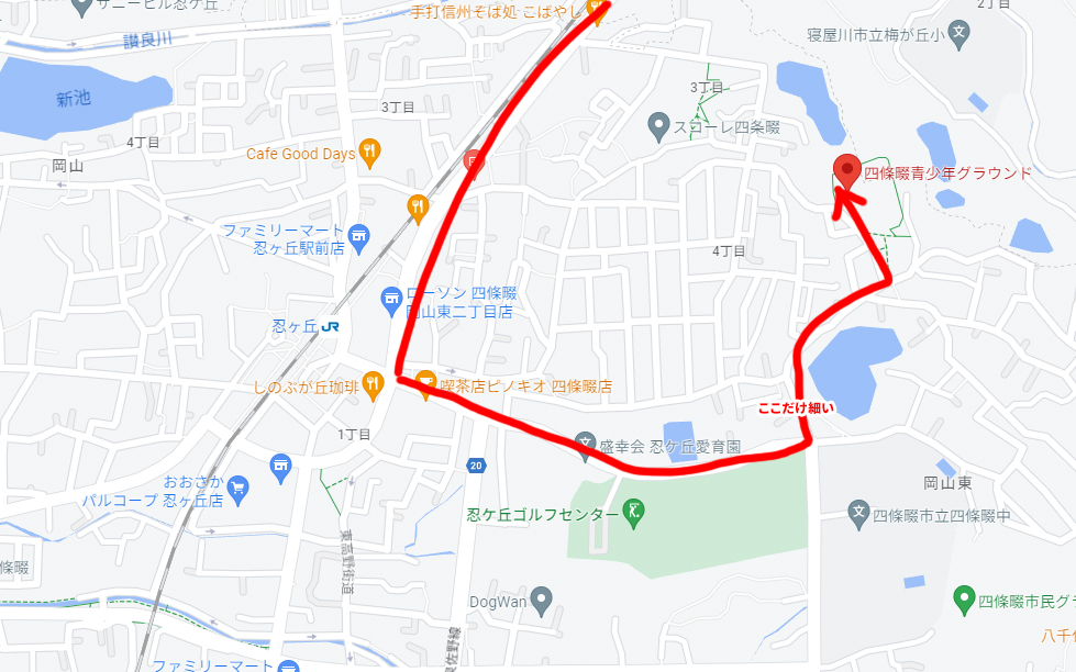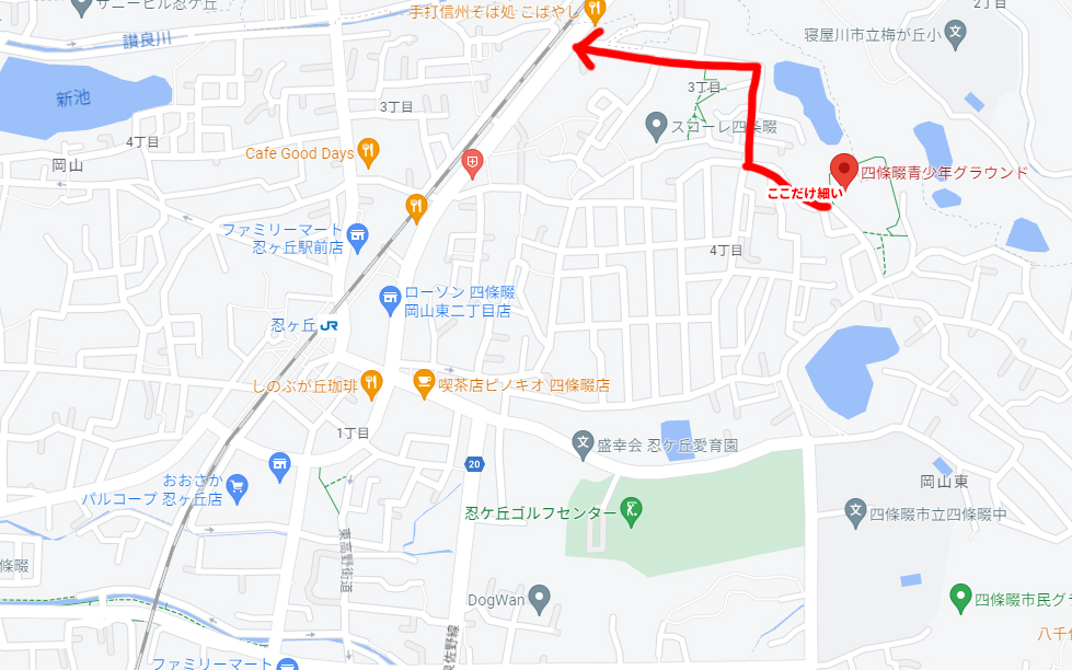 四條畷青少年グラウンドは忍ケ丘の駅から車で5分くらいのところにあります。