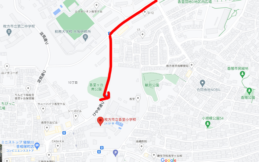 小学校の場合、裏門(運動場に入る門)のみ開いているケースがあるんですが、香里小学校の場合はけやき通り側の正門から入ります。(正門は香里ヶ丘南公園側にあります。)